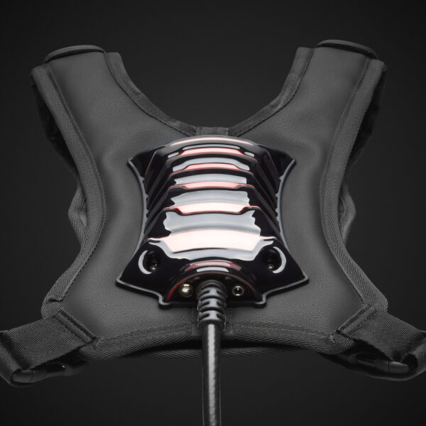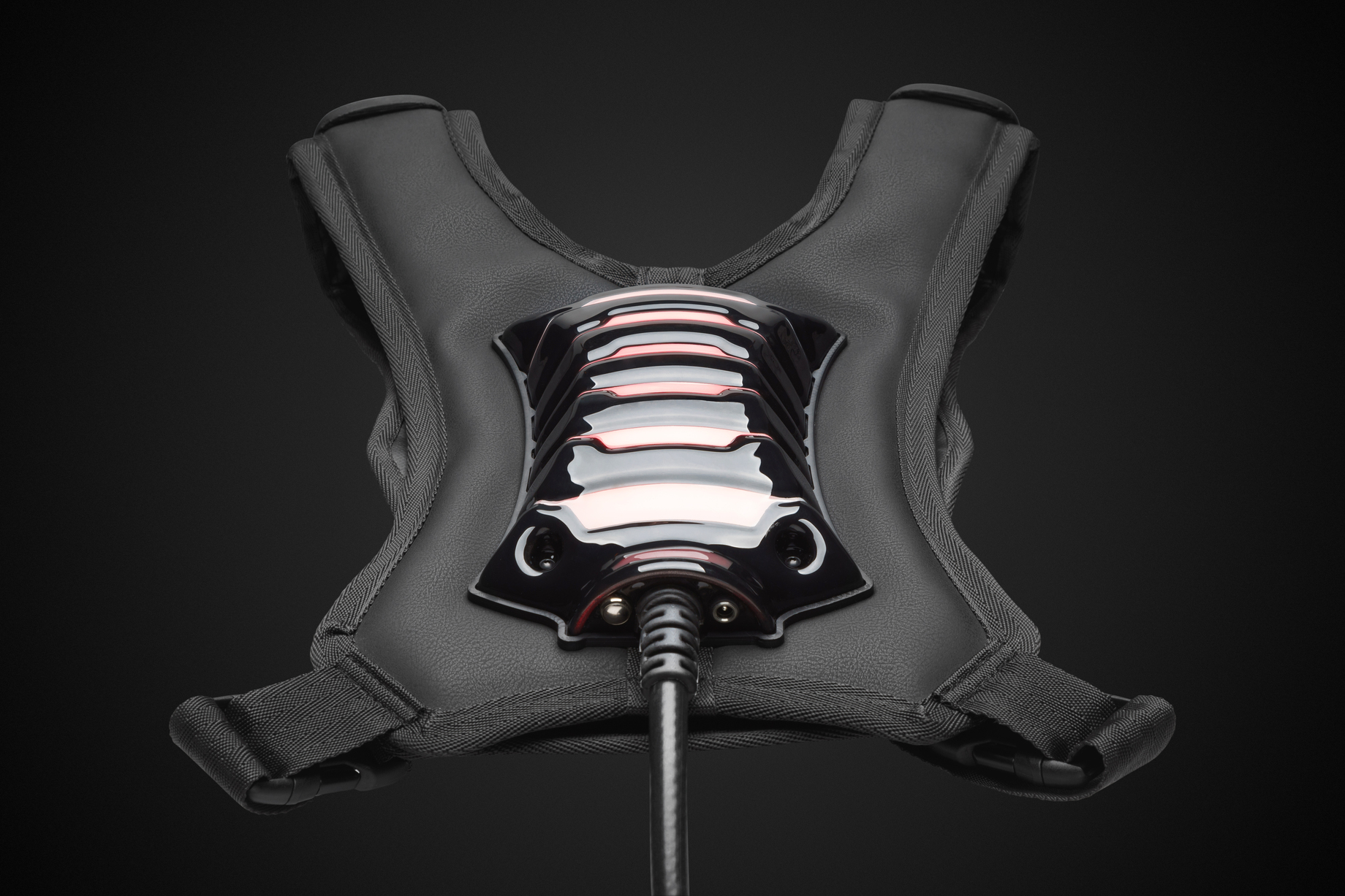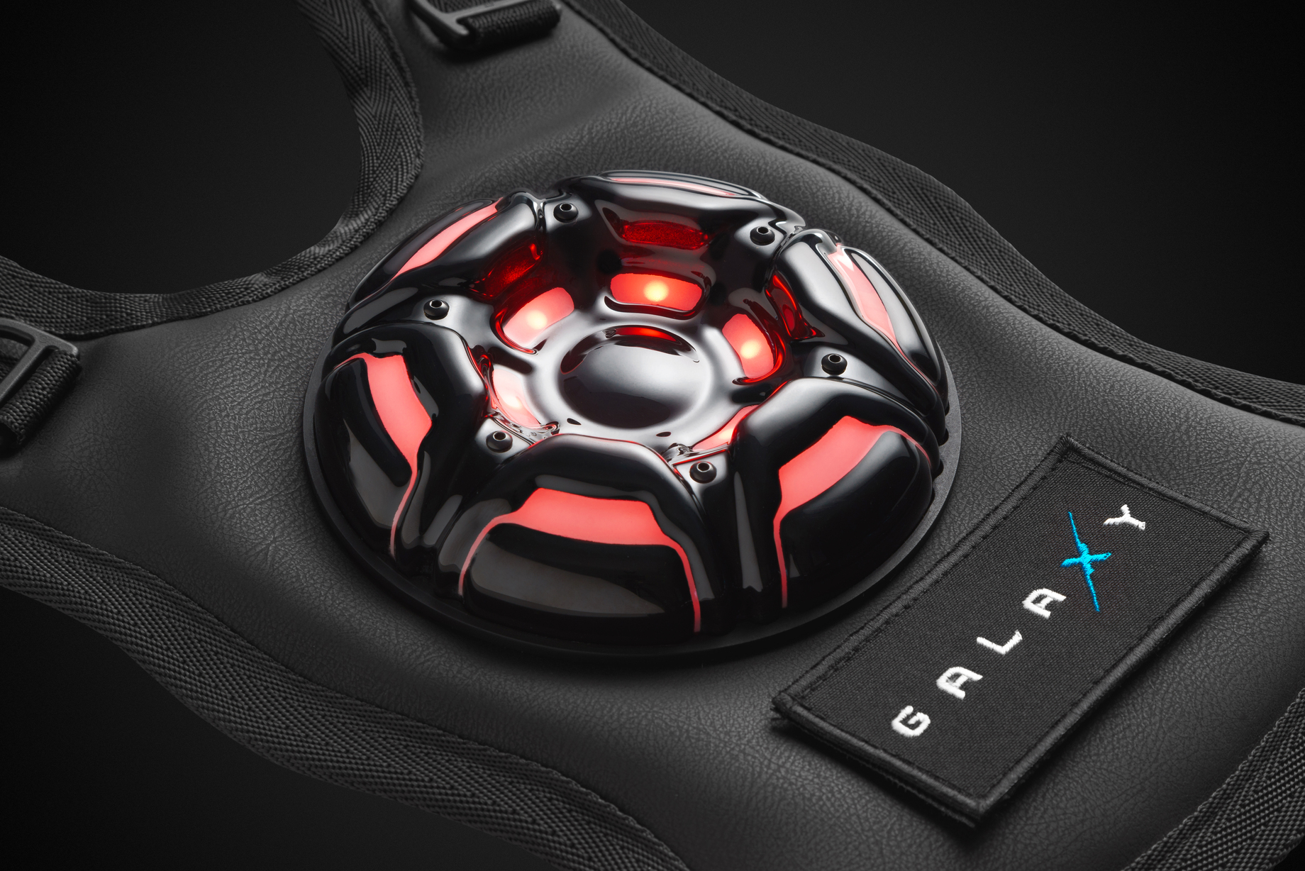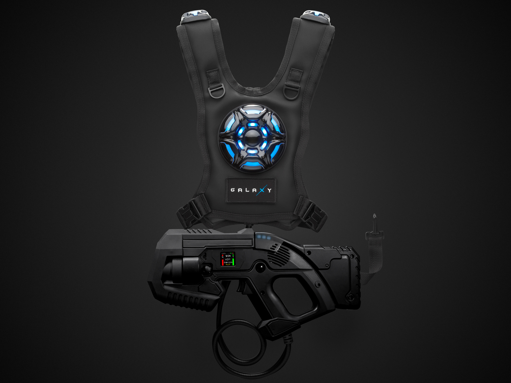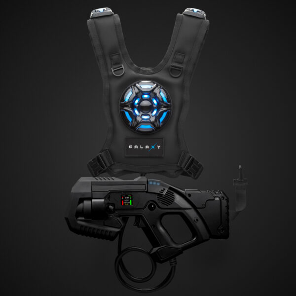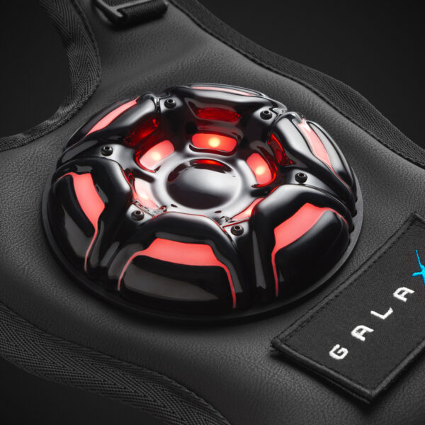 Alt text: Player wearing Eclipse series laser tag vest in dark arena lighting.